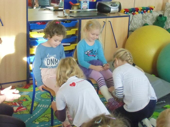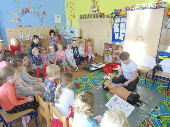 V pátek 30.11. měly děti možnost vidět a zkusit si, jak by měla probíhat první pomoc u raněného člověka. Paní z Českého červeného kříže dětem nejprve krátkou písničkou ukázala, na jaká čísla volat a v jakých případech. Poté už jednotlivě ukazovala různé možnosti, co dělat když najdeme zraněného. Na figuríně si starší děti ze ZŠ vyzkoušely masáž srdce a umělé dýchání. Seznámily se se stabilizovanou polohou, obmotávaly obvaz na hlavě a noze na čas.